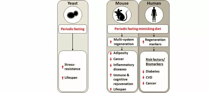 轻断食的效益在酵母与小鼠研究中得到证实,目前在进行人类试点研究(图片来源:Valter Longo/Cell Metabolism 2015)