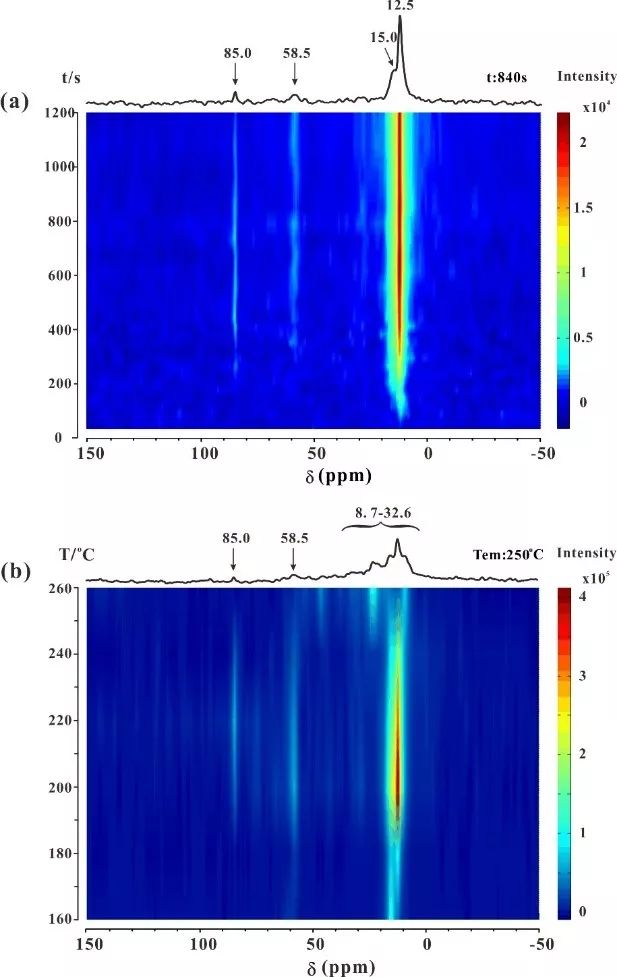 图1. H-ZSM-5分子筛上乙醇反应后的二维13C–13C INADEQUATE NMR图谱(左)与 乙醇变温反应的原位13C MAS NMR 图谱(右)