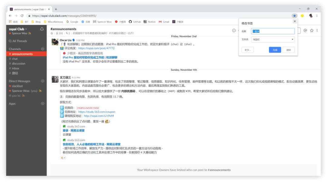 首先,用 Chrome 浏览器打开想要转换为「桌面客户端」的网页(我以少数派的 Slack 群为例子,地址为:https://sspai-club.slack.com/messages),将登录后正常使用状态的网页 URL 收藏到书签栏: