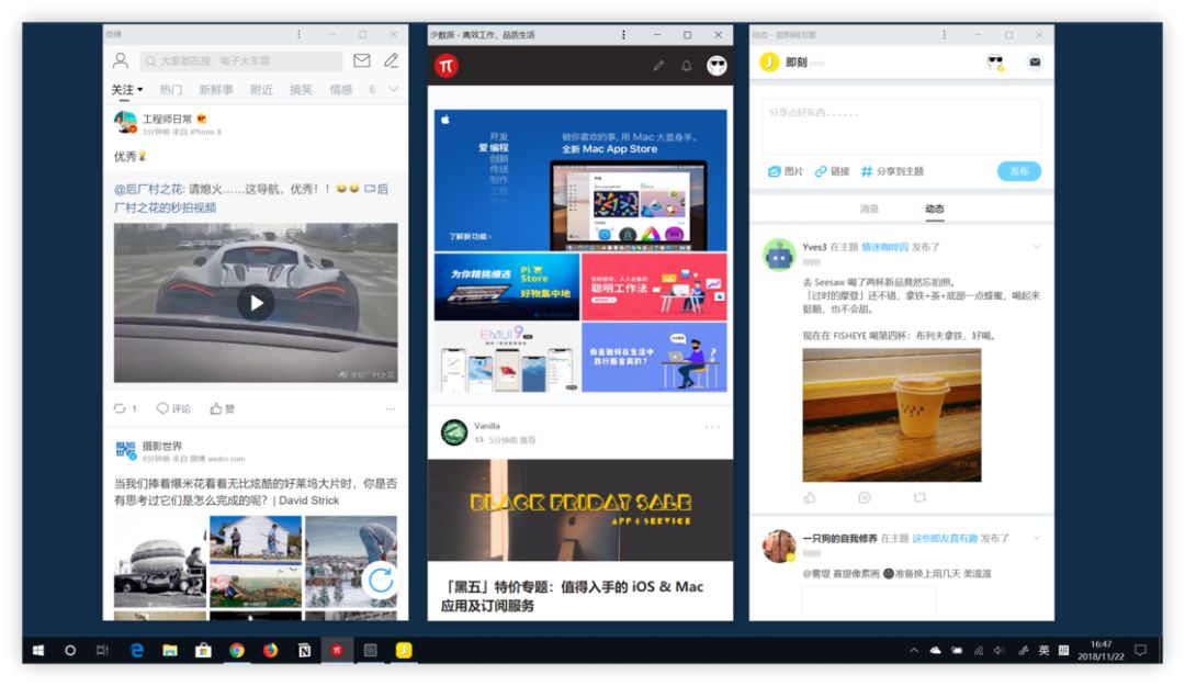 与此同时,除了解决字体渲染的问题,那些只提供手机端 App 的应用(比如我派和即刻)、或是桌面版本的应用支持得很垃圾的应用(比如微博提供的那令人绝望的 UWP 版本客户端),我们都可以利用这样方便的办法来给我们自己做一个「客户端」。