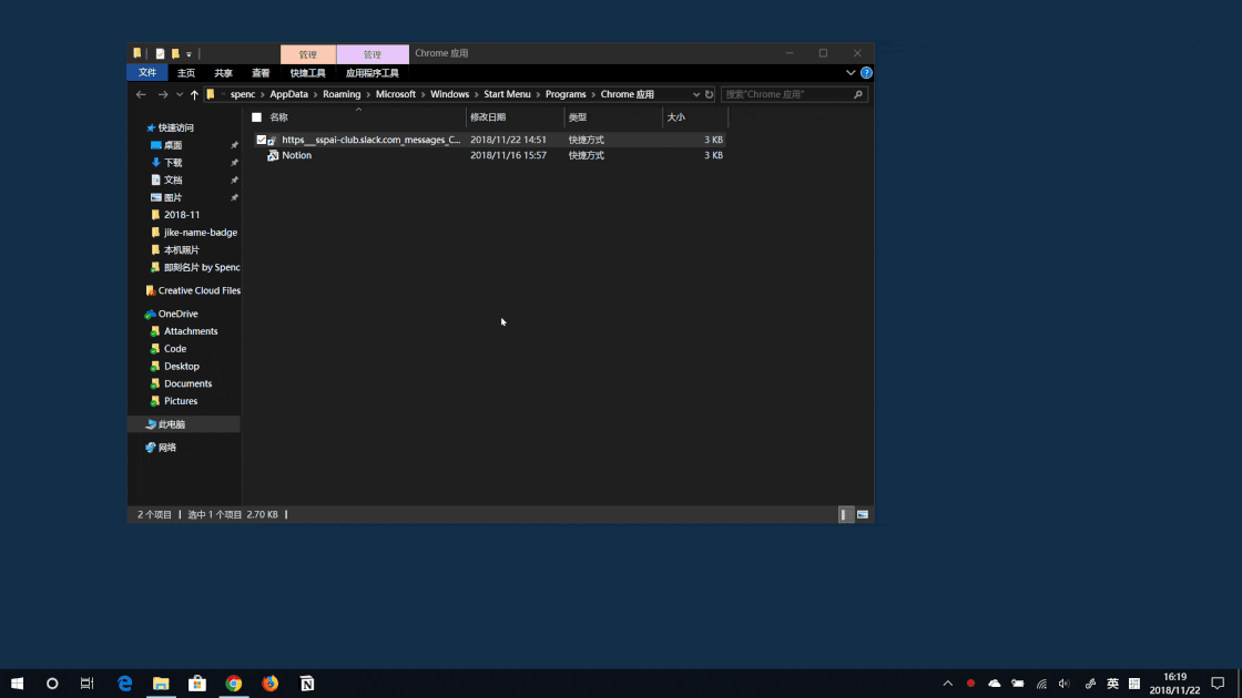 不过,我们会发现这个快捷方式的名称和图标都有问题,我们「右键 > 更多 > 打开文件位置」,就来到了 Chrome 应用快捷方式的文件夹。在这里,我们可以直接修改其文件名,并通过「右键 > 属性 > 更改图标」来配置其图标: