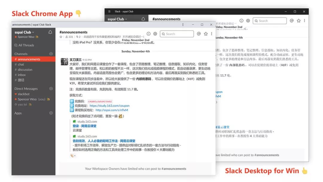 Slack Chrome App 和 Slack Desktop for Windows UI 字体对比