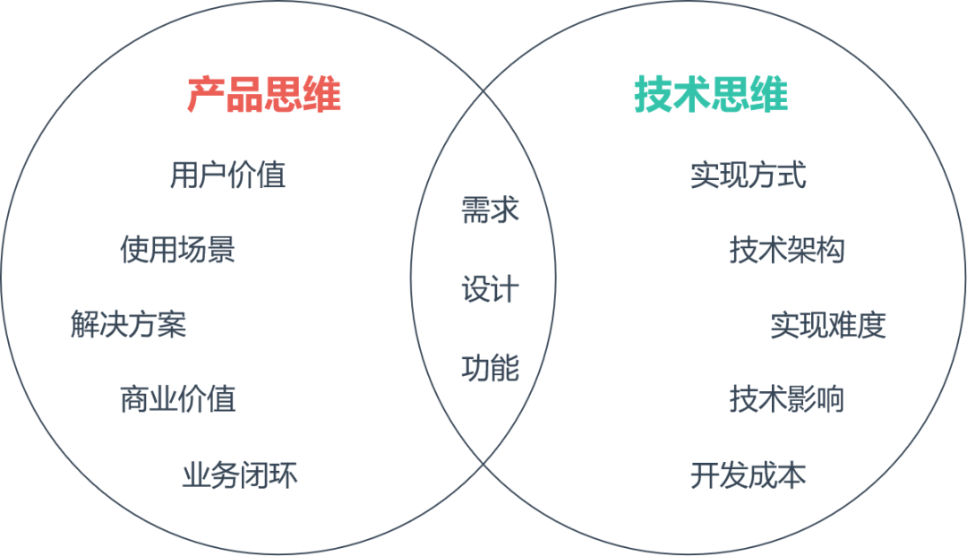 从上图可以看到,产品和技术的思维方式大有不同,产品思维偏用户视角,技术思维偏技术视角。技术背景的同学,多半对用户、场景、痛点不是那么敏感,没有从用户的根本需求出发,缺乏对产品细节问题的思考,缺乏产品感。