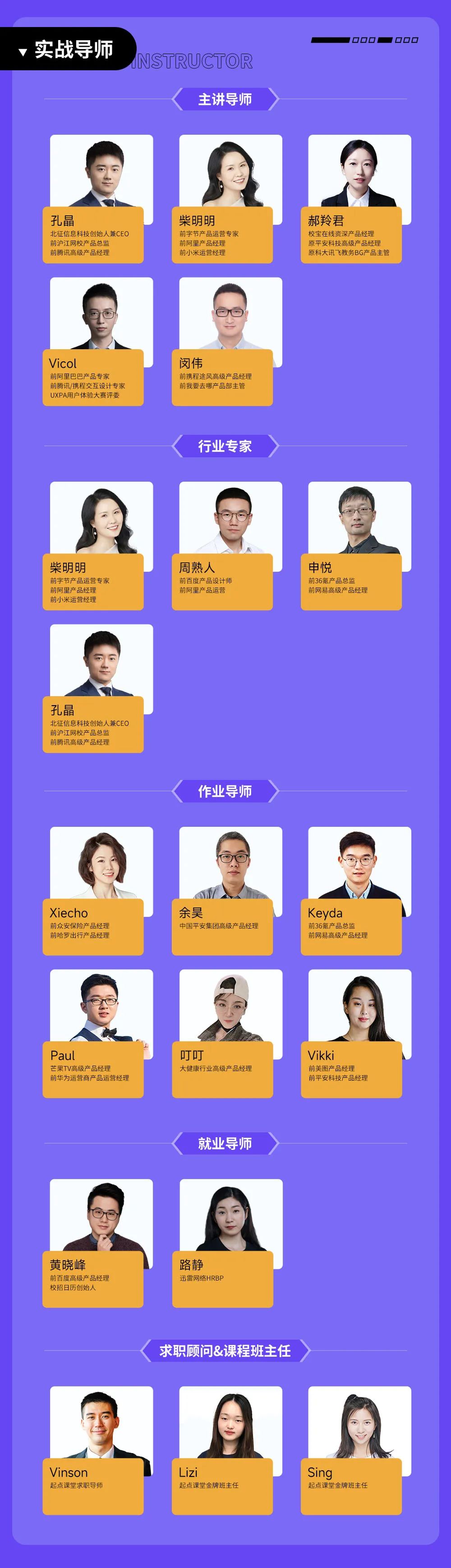 课程导师团集合了多位顶尖导师,他们均来自一线互联网大厂,配备了主讲导师、作业导师、就业导师、行业专家、班主任、助教等6个重要角色。
