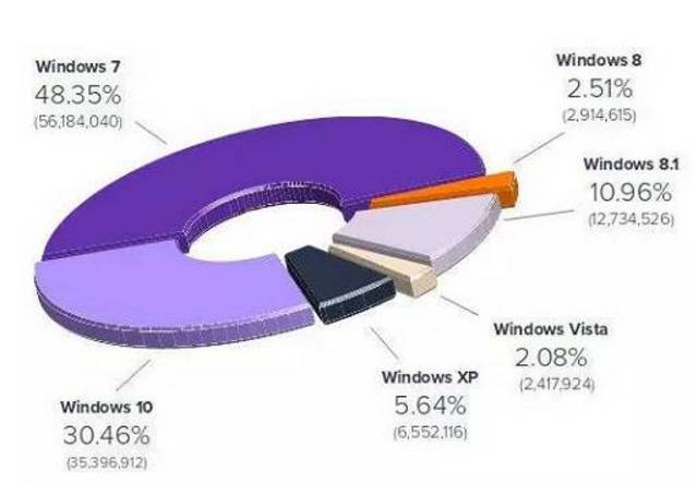 根据最新份额统计,微软目前最受欢迎的系统仍旧是 win7,看来win10的脚步要加快了。