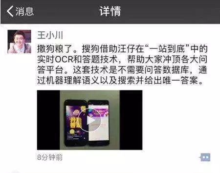 搜狗和清华大学天工智能计算研究院联合开发的“汪仔答题助手”。用户在答题开始前,准备好两台手机,一台手机进入直播答题页面,另一台手机进入答题助手页面。开始答题时,“汪仔答题助手”就会自动搜索并显示出题目以及答案。