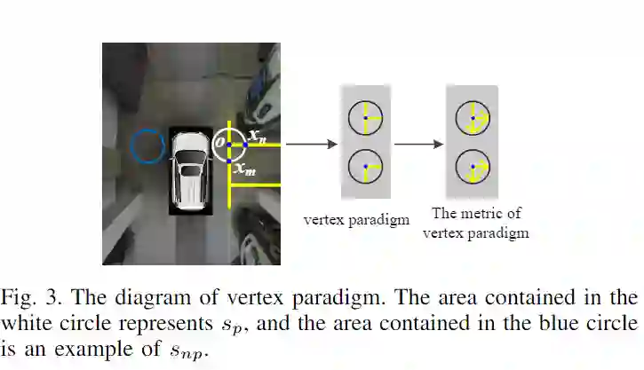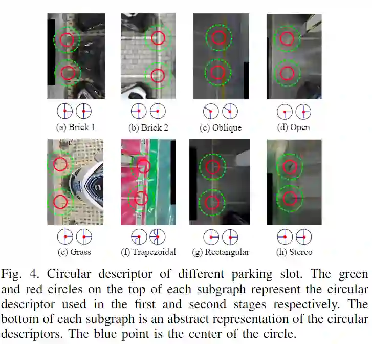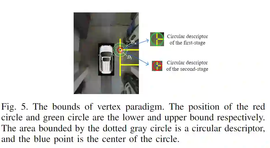 在现有的停车位检测方法中,很难找到通用的特征描述符来描述具有复杂和可变类型的停车位顶点。因此,本文将各种类型的停车位顶点定义为通用特征表达,并使用该范式描述不同类型的停车位顶点。与以前的矩形描述符和方向描述符相比,本文提出的圆形描述符可以描述不同类型的停车顶点模式。
