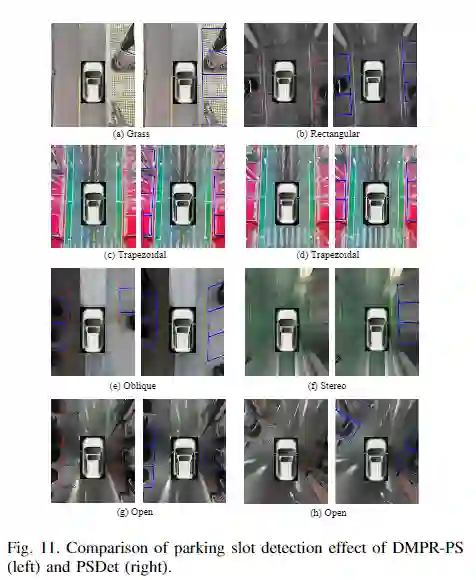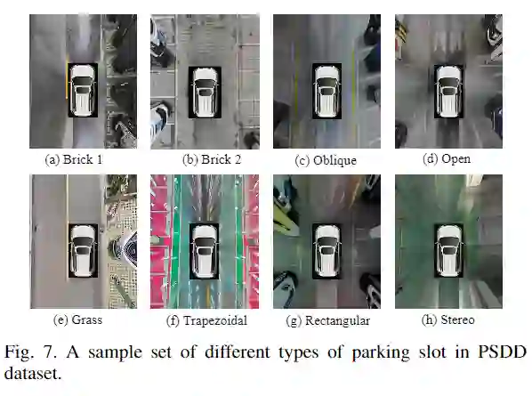 此外,为了验证实际应用中的性能,本文收集并标注了大规模benchmark停车位检测数据集(PSDD),该数据集由7种停车场景组成,包括砖、草、斜面、梯形、开放、矩形和立体停车位。实验证明了本文的方法在PSDD和ps2.0数据集上的有效性和效率。结果表明,PSDet在实现竞争性能的同时,其计算复杂度要比其他方法小得多。