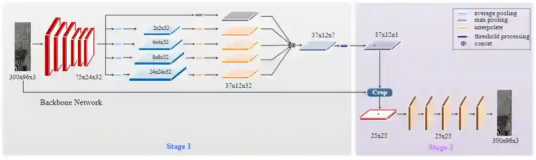 图1.本文提出的PSDet的体系结构。该模型是一个级联结构,第一级主要由backbone,几次下采样操作和插值过程组成。将这些插值后的特征图连接起来以获得包含标记点初始位置的特征图。在第二阶段中,将在第一阶段中获得的标记点的粗略位置作为中心来裁剪子图像,这些子图像被用作卷积神经网络的输入。最后,检测子图像中标记点的准确位置。
