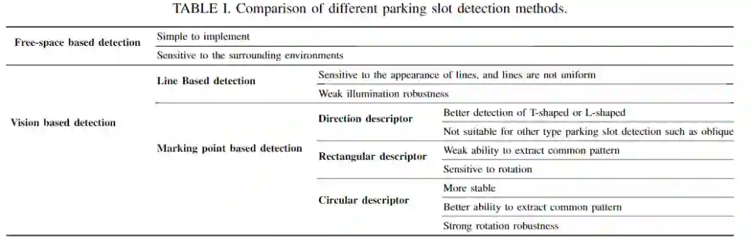 表I列出了不同的停车位检测方法的比较。