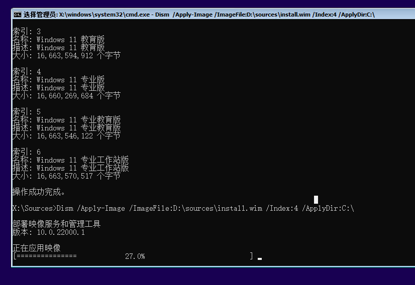 Dism /Apply-Image /ImageFile:D:\sources\install.wim /Index:系统索引号 /ApplyDir:C:\