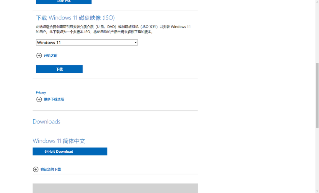 上提供了完整的系统镜像下载,点击「下载 Windows 11 磁盘映像 (ISO)」并选择下载项,选择你想要下载的镜像版本(Windows 11 或者 Windows 11 家庭版仅限中国),然后点击「下载」后选择产品语言,默认选择「简体中文」然后点击最后的「确认」,最后点击「64-bit Download」下载并保存系统安装镜像文件。