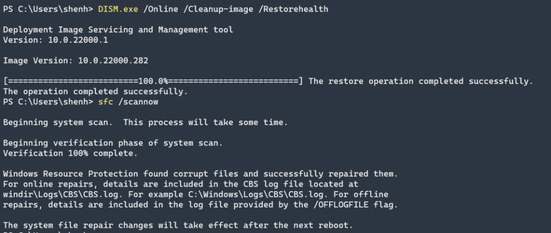 命令将扫描所有受保护的系统文件,并使用上一个命令里修复好的系统镜像去替换已经损坏的系统文件。