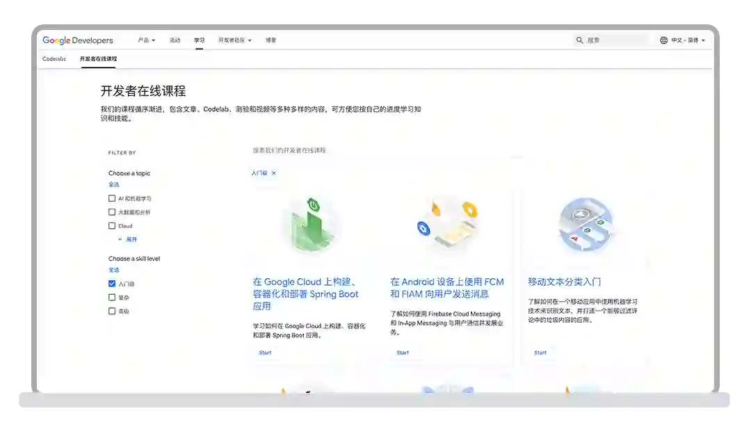 谷歌持续为开发者提供学习资源支持,提供免费的线上学习资源,希望助开发者探索前沿开发技术,不断拓展知识技能。