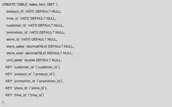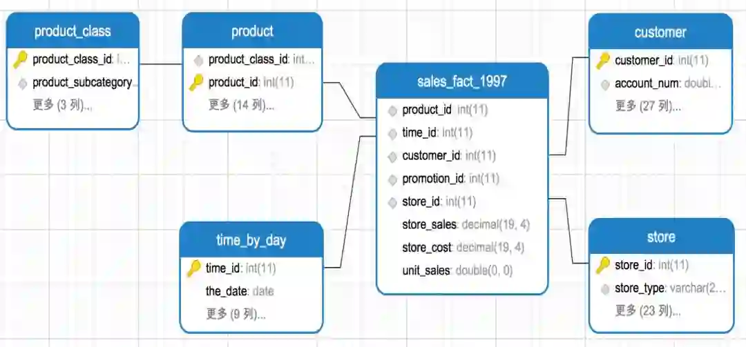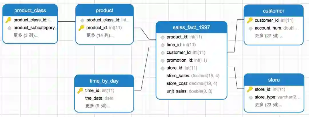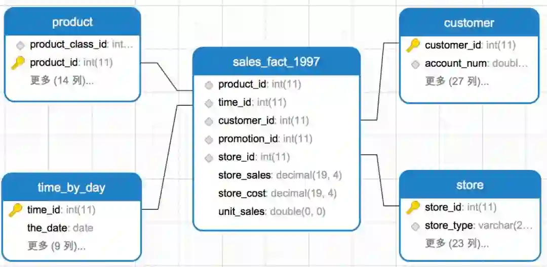以下示例为星型模型:其中sales_fact_1997为事实表,存储客户在某个时间、某个商店、购买了某个产品,购买量和销售额的信息,记录的是一个下单过程。事实表sales_fact_1997通过外键product_id、customer_id、time_id、store_id分别与维度表product(产品维表)、customer(客户维表)、time_by_day(时间维表)、store(商店维表)相关联,关联关系为多对一关联。