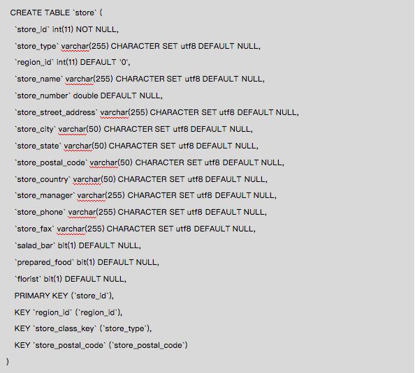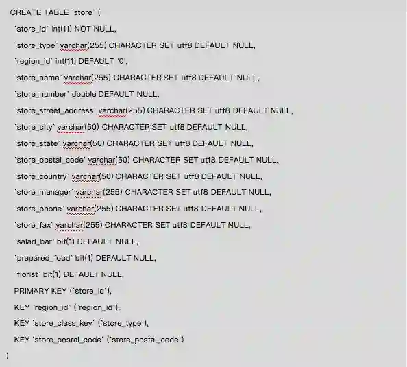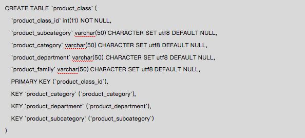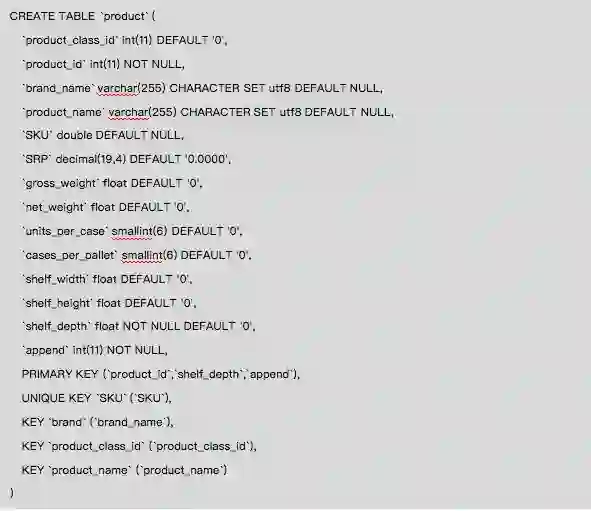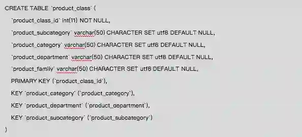 下面示例product(产品)维度表与product_class(产品类别)维度表通过product_class_id相关联,关联关系为多对一。product_class没有与sales_fact_1997事实表直接关联。