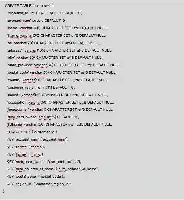 下面罗列出以上示例中用到的表的建表语句,需要在 MySQL数据库下执行,其他类型数据库需要做一些调整。
