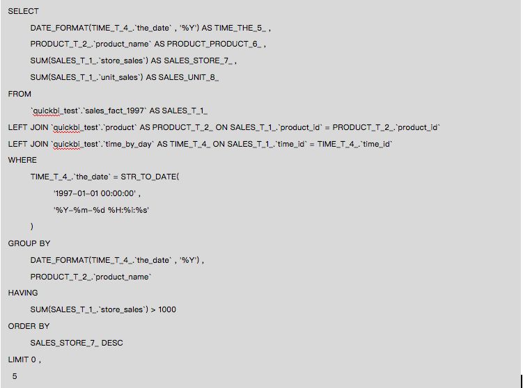 需求场景:按日期、产品查看总的销售额、销售量,日期限定在1997年,总销售额限定在1000元以上,结果按照总的销售额倒序排列,看前5个。
