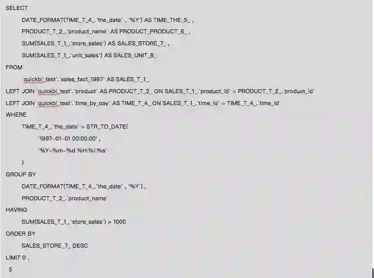用到的分组字段:the_date、product_name, 其中分组字段the_date为日粒度,需处理为年粒度:DATE_FORMAT(`the_date` , '%Y')