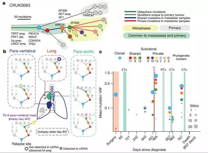 编号CRUK0063患者同时入组了PEACE试验,于死后尸检时检测所有转移病灶的基因突变频谱。其原发灶、术后467天的椎旁转移灶、术后857天尸检取出的6个瘤灶(包括主动脉旁、椎旁、肺内转移灶)均纳入肿瘤系统进化结构的分析。结果显示,7个转移灶均起源于原发灶中的同一亚克隆祖先,即种系发生聚类8。其中6个转移灶区域也共有同一晚期的种系发生聚类12;另一不含聚类12的病灶为主动脉旁转移灶,其包含一特有的亚克隆,聚类9。