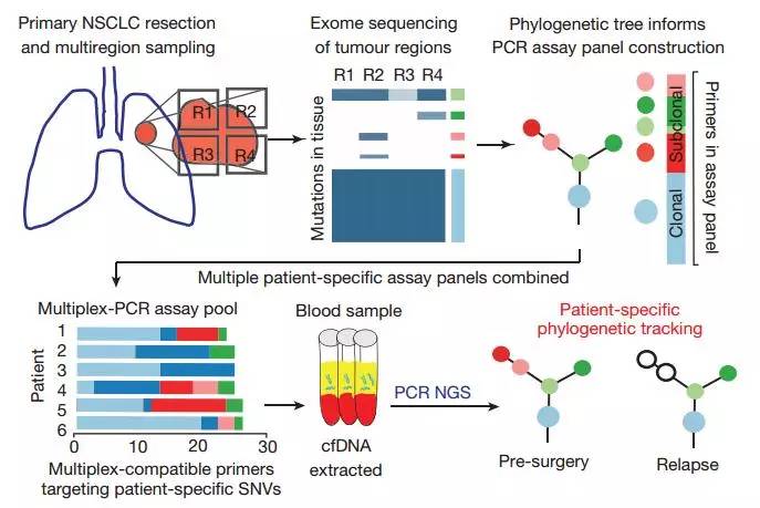 晚期转移性NSCLC并未能从系统性化疗中获益较多,而术后辅助化疗可延长可手术肺癌的总生存率约5%。这种生存获益可能源于肿瘤体积小、其瘤内异质性也较低。既往研究发现,乳腺癌、直肠癌术后血浆ctDNA检测能够在任何提示转移的临床指标出现之前而鉴别出术后可能复发转移的患者,从而及早制定相应的干预措施、改善患者生存。作为前瞻性研究肿瘤进化机制的多中心临床试验,TRACERx研究基于多区域、动态采样,使用多通道PCR二代测序方法(NGS)检测肿瘤组织和ctDNA基因谱改变,从而揭示了早期肺癌及其术后复发过程中的肿瘤种系变化框架。