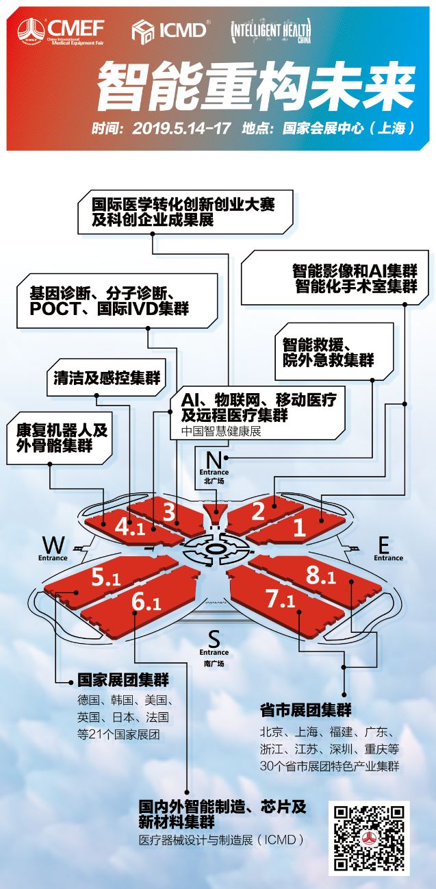未来已来,智能重构未来。以人工智能为核心的“智能技术”正成为医疗健康领域又一次重构与变革的开端。从人工智能对医疗行业生产力的提高、生产方式的改变到底层技术的驱动、再到医学诊断流程的优化、应用场景的不断拓展,各类智能技术正在以惊人的速度席卷医学健康的各个角落。CMEF作为全球医疗科技创新的“大本营”,致力持续发挥平台引领、创新、赋能、融合、共创、共享、共赢的价值理念和品牌影响力,以行业需求为导向,以科技创新为宗旨,携手实现跨越式大发展全球健康梦!2019年5月14-17日上海国家会展中心,更多CMEF现场亮点,等你来发现!