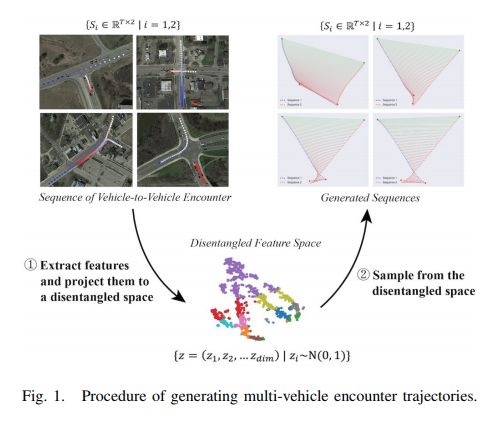 多车辆轨迹生成器(MTG)可以将多车辆场景(驾驶相遇数据)编码成可用于产生新的高质量驾驶相遇数据的刻度表达。这种发生器模型包括双向变分自动编码器和多分支解码器两大部分。