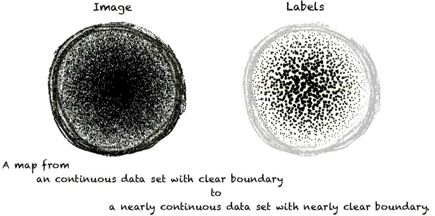 对于图像识别或图像分类任务而言,机器学习的目标是建立一个连续的数据集(图像数据)到一个近乎连续的、有着接近清晰边界的数据集(标签)之间的映射关系。