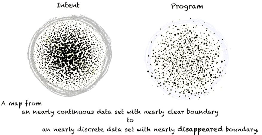 如上图所示,这是从一个较为连续的、有着较清晰边界的数据集,向一个更加离散而没有清晰边界的数据集进行映射。