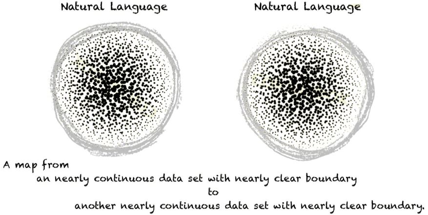 对于自然语言处理任务而言,机器学习需要从一个较为连续的(离散度高于图像)、有着较清晰边界的数据集建立与另一个较为连续的、有着较清晰的边界的数据集之间的映射关系。