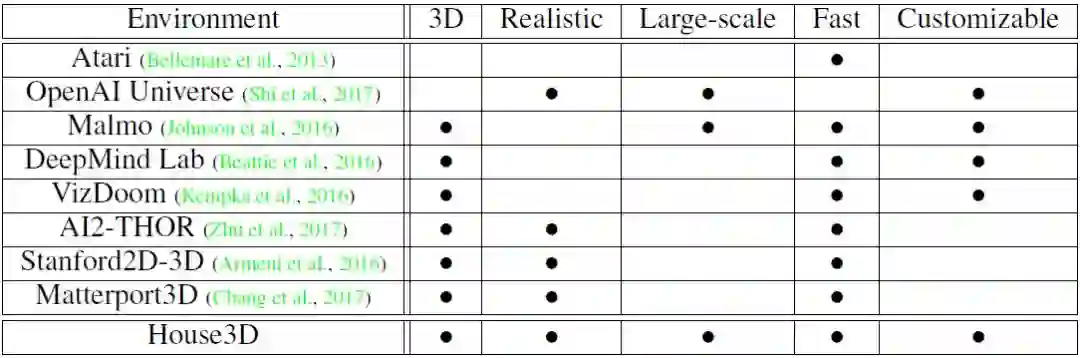 表1:常用环境总结。属性包括3D:渲染对象的3D本质;真实(Realistic):与现实世界的相似度;大规模(Large-Scale):大型环境集合;Fastspeed:快速渲染;可定制(Customizable):可定制用于其他应用的灵活性。