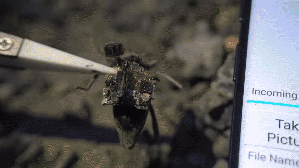电子设备的执行器重 248 毫克,并且可以根据智能手机的命令将相机转向 60 度。制作好的相机约为硬币大小,以每秒 1 到 5 帧(fps)将 “第一人称主视角” 以 160*120 像素的单色视频传到距离 120 米远的蓝牙无线电中。