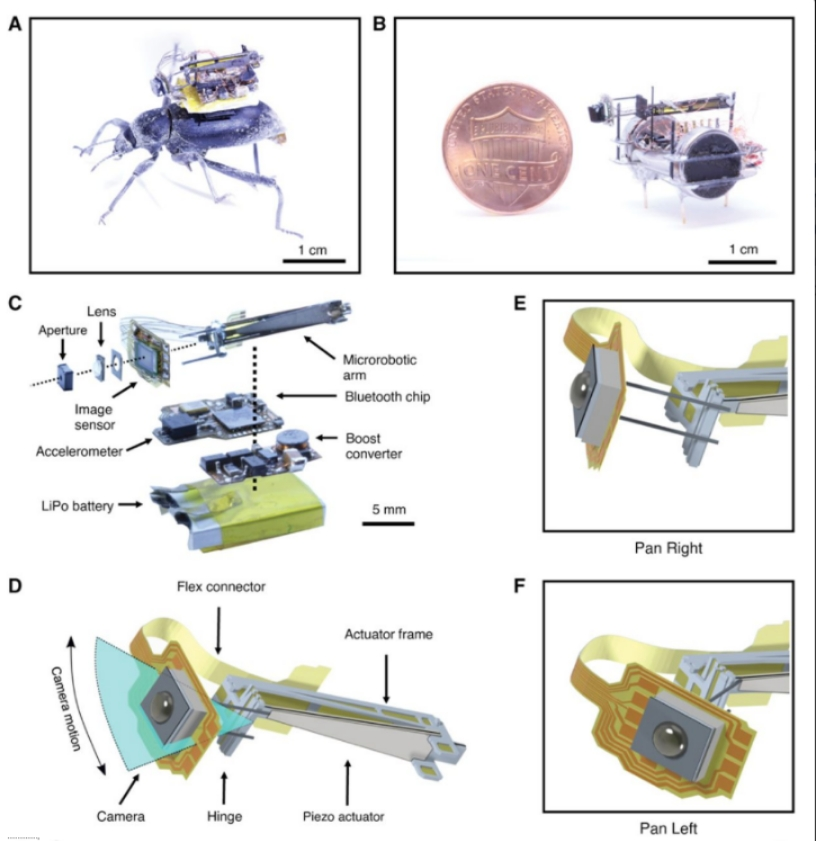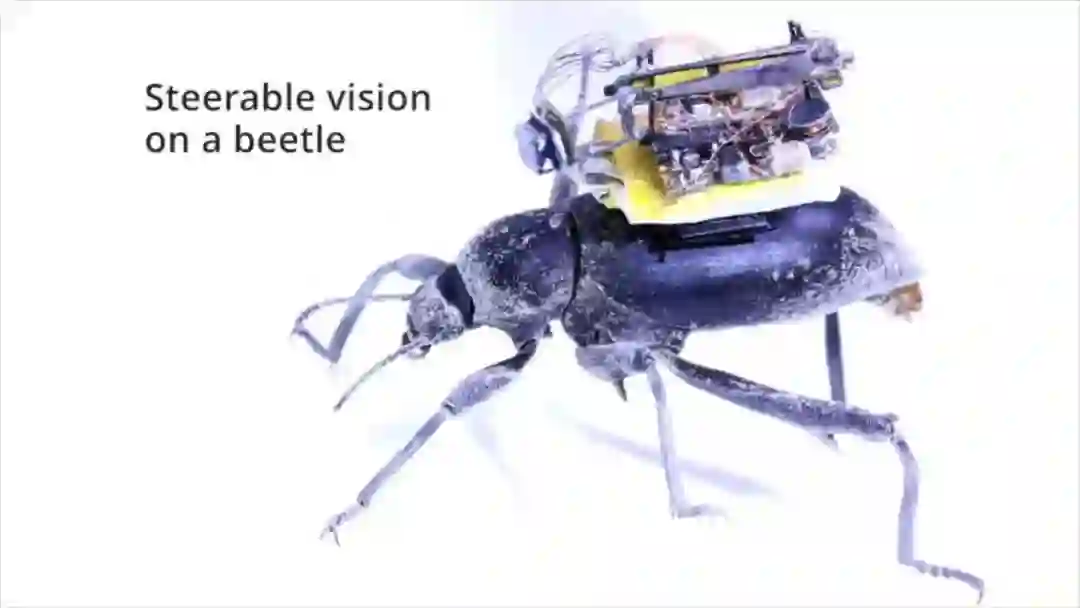 用这样的方法,研究者开发了一个完全无线的机械可操纵视觉系统。它的形状因子足够小,可以安装在活的甲虫和类似大小的陆地机器人的背上。