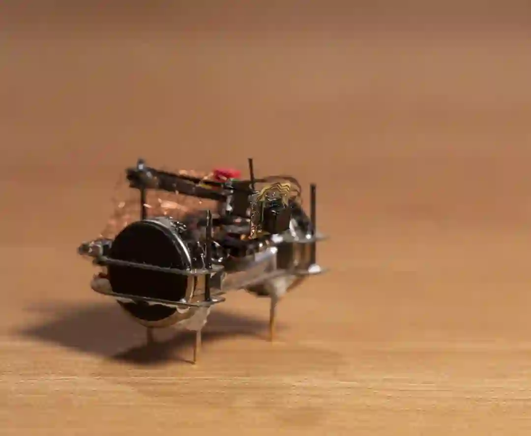 鉴于昆虫是活体,不容易操纵,研究者还设计了一款小型昆虫规模的机器人,以便对其进行完全的远程控制。这是有史以来最小的具有动力自主功能的地面机器人,体型为 1.6 厘米 x 2 厘米,移动速度约为每秒 3.5 厘米,在现有的供能条件下可连续运行 63 到 260 分钟。