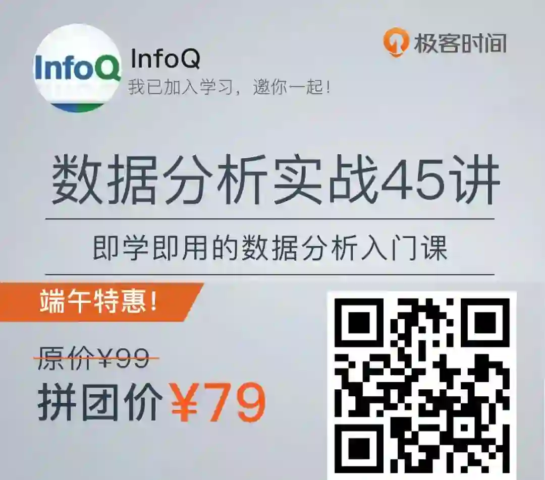 现在要插播一下,今天有个端午专属粉丝福利:《数据分析实战 45 讲》限时优惠只要 79 元,原价 99 元,便宜 20 元,但仅限今天 24 小时。想扩大自己能力边界的同学们,请抓紧搭上这个快车。