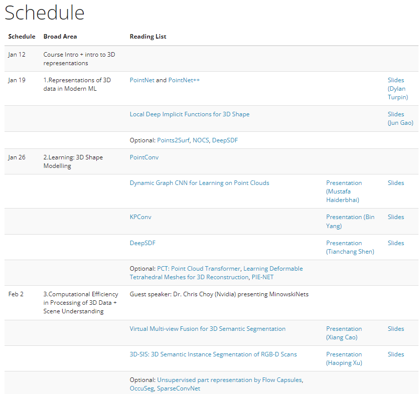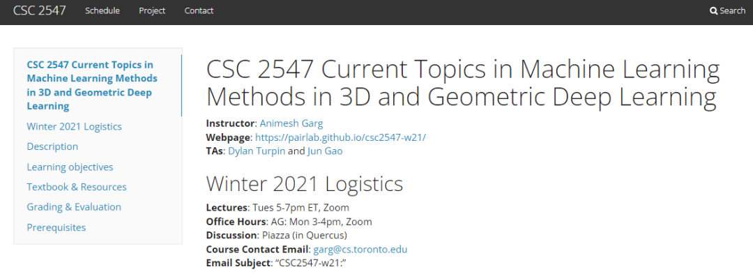 CSC 2547 是多伦多大学的一门课程,主要介绍了几何深度学习方法和 3D 视觉的最新进展。近期 2021 年冬季的 CSC 2547 课程已全部上线,课程视频和讲义资料均公开可看。