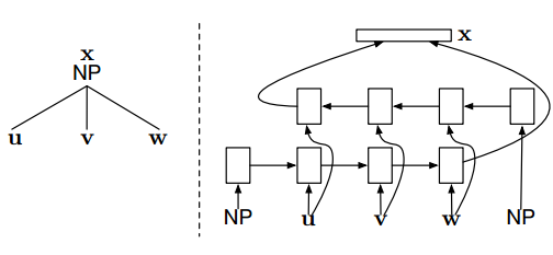 图 2:在每个 REDUCE 运行中,RNNG 的结构功能;右边的网络是左边结构的建模 (Dyer et al., 2016)。