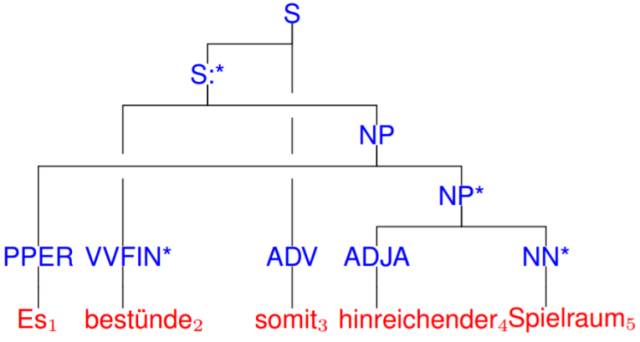 图 1:从 Tiger 语料库(移除了标点)中提取出的不连续树