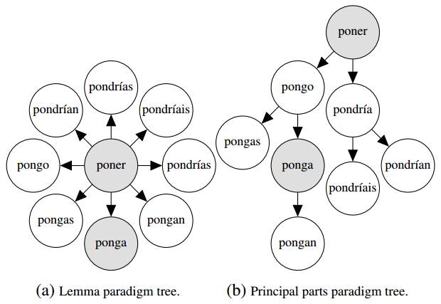 图 1:两个潜在的图模型,用于实现范式完成。(a)的拓扑结构编码了网络,其中所有的形式都是依据词素预测出来的。(b)是一个以主体构形为灵感的拓扑结构。