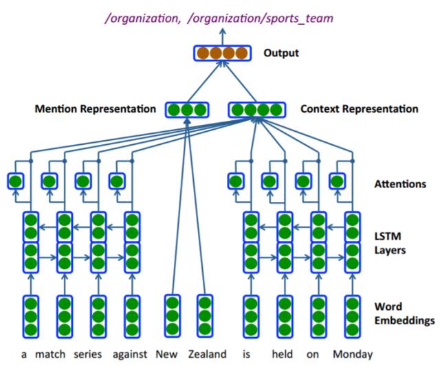 图 1:在表达「a match series against New Zealand is held on Monday」中预测提及「New Zealand」的细粒度语义类型的注意编码器神经模型(attentive encoder neural model)的图示