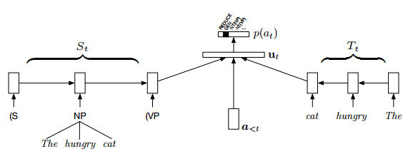图 1:RNNG 的组成部分:一个堆栈、、生成词汇的缓冲器和导致当前配置的过往动作的列表。每个部分都被嵌入了 LSTM,解析器状态总结 ut(如图)被视为顶层特征,用于根据所有可行动作预测一个 softmax. 上图源于 Dyer et al. (2016)。