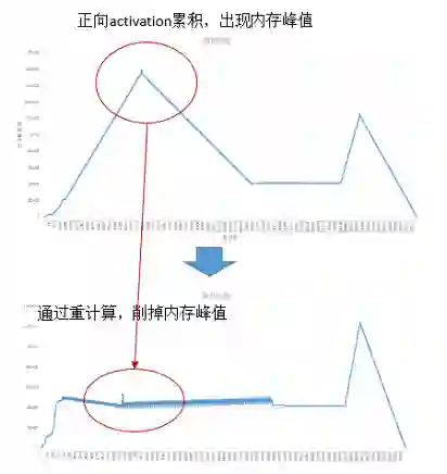 针对正向算子的输出累计保存在内存中,导致内存峰值过大的问题,舍弃了部分正向算子的输出,而是在反向阶段用到时再重新计算一遍。这样做有效地降低了训练过程中的内存使用峰值。如下图所示,第一个内存峰值通过重计算消除,第二个内存峰值可以通过前面讲到的优化器并行消除。