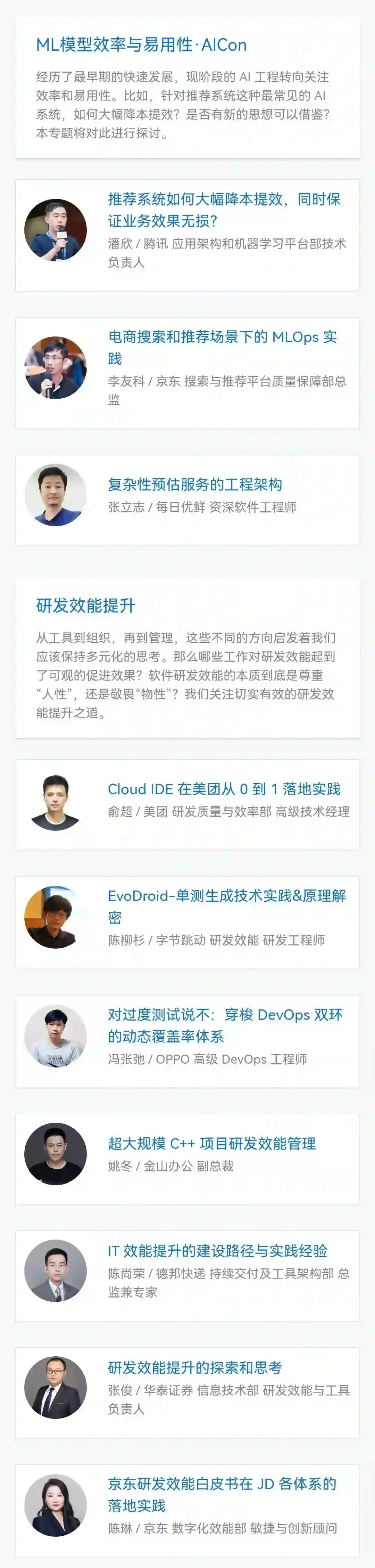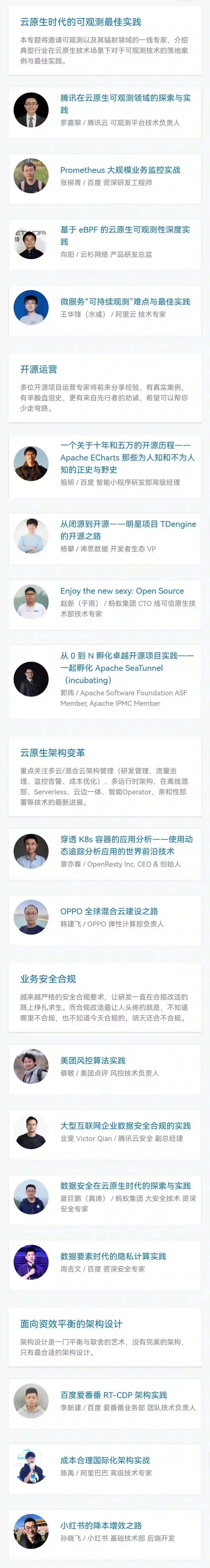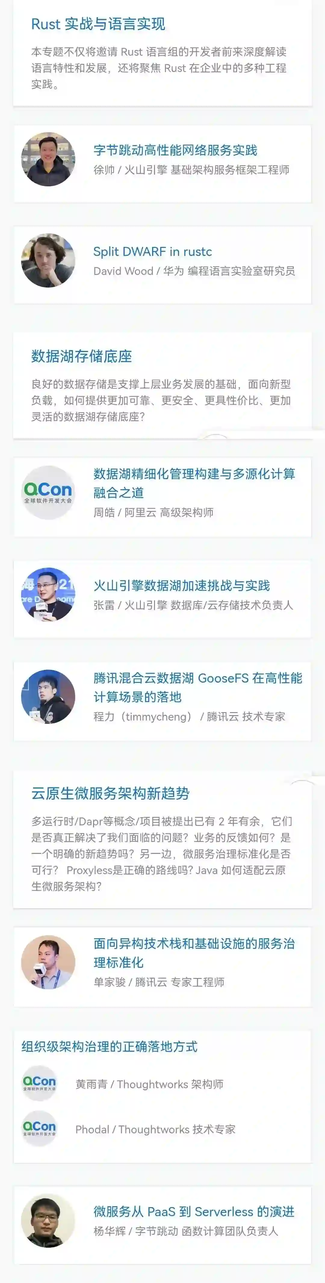 此外,我们还策划了 Rust 实战与语言实现、云原生时代的可观测最佳实践、研发效能、业务架构、云原生微服务架构新趋势、ML 模型效率与易用性、AI 基础架构等 27 个热门专题,目前已上线 80% 的内容和会议日程,点击底部【阅读原文】了解更多专题详情。