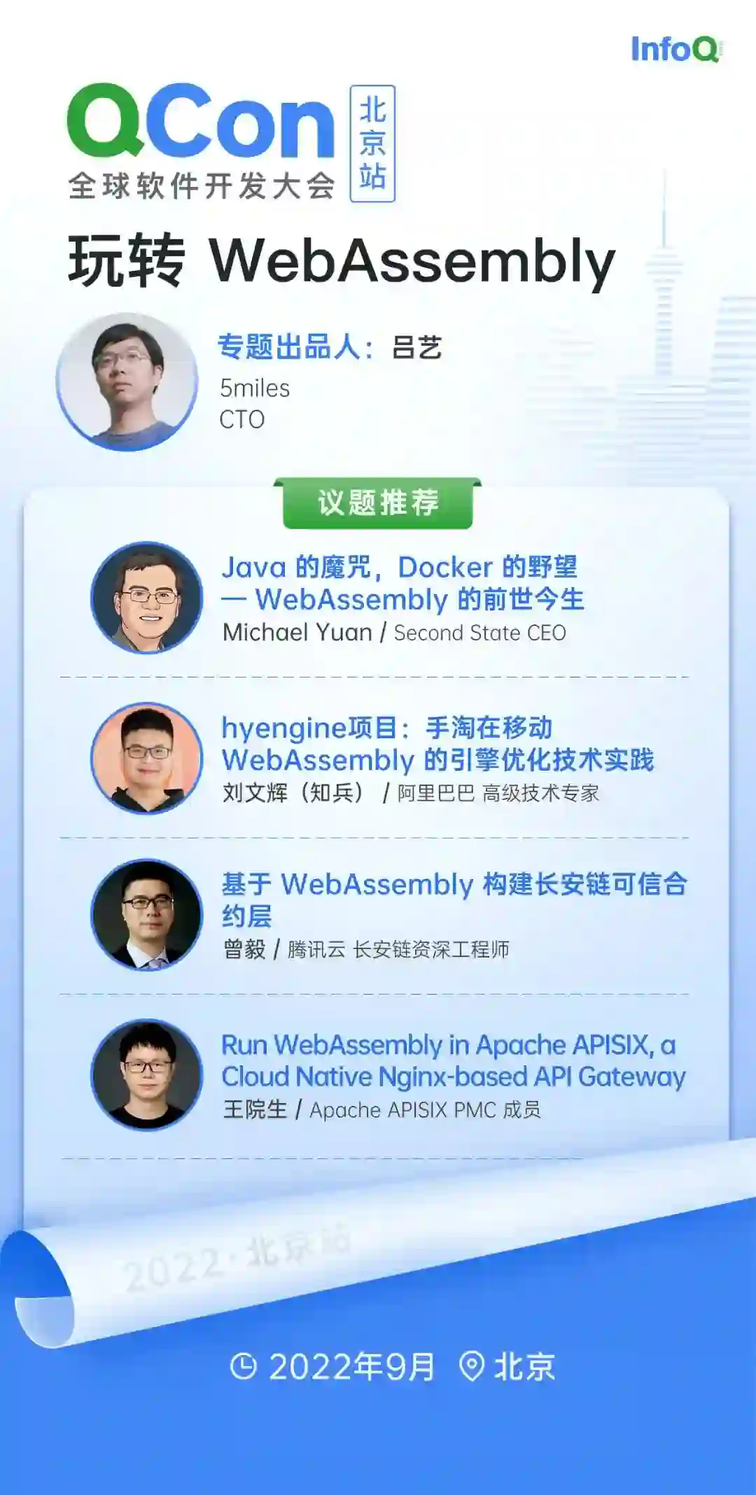 为了给大家提供更多思考,今年 9 月,QCon 全球软件开发大会(北京站),我们设置了「玩转 WebAssembly」专题,邀请了美国本土知名电商平台 5miles 的 CTO 吕艺担任出品人,我们将从前后端等多重视角探讨 Wasm 的落地进展,帮你用上和用好 Wasm。