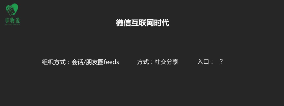 大家开始做微信群、养微信个人号发朋友圈。随之而来的是,获取用户最好的方式是社交分享。因为微信里没有了中心化流量入口,我们想要触达用户只能通过社交分享,到达群聊、朋友圈 、私聊里。