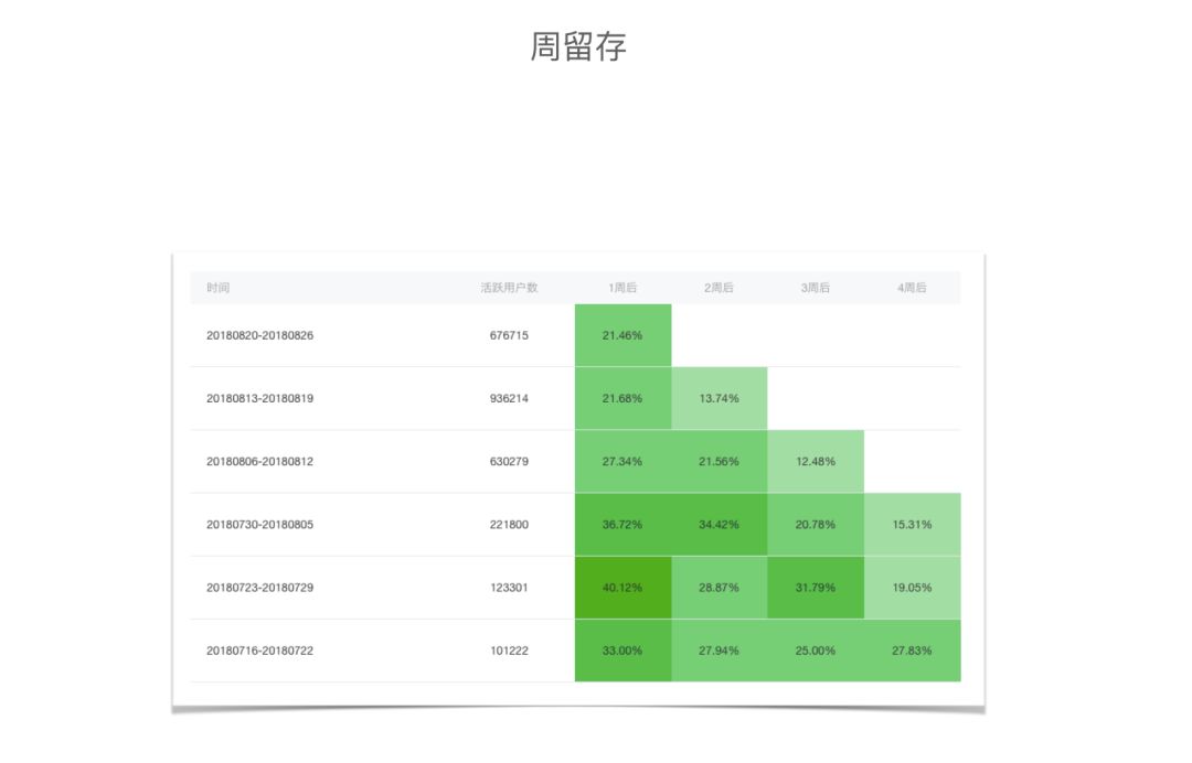 未能导入 app、公众号的小程序用户,我们有个简单的模型,做促活、回访。上图是我们的留存数据,周留存 30%+,一月后留存 20%+,说明还有很大的改进空间。