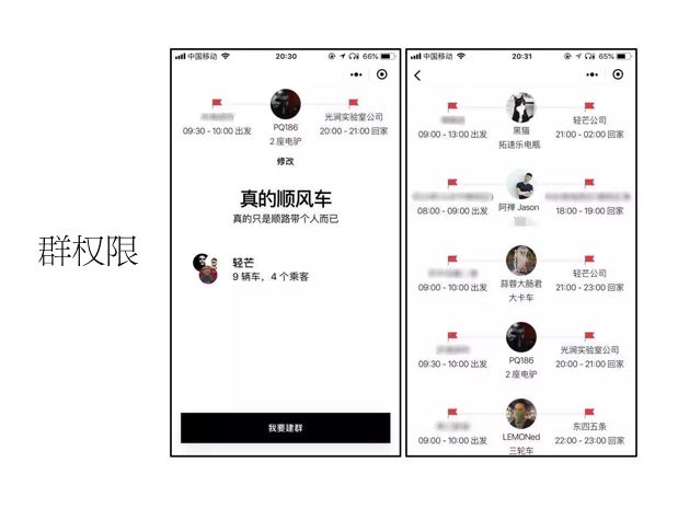 我们花了两三天时间做了一个小程序-安全性的顺风车。这个小程序的玩法是这样的:我分享到特定的群,这个群的群友搭我的车。这些群是什么关系,我们认为是熟悉的陌生人,是有一定交集的。这是微信提供的东西,你从群里进来到小程序有一个特定的 ID。这个时候你就不需要做什么复杂的关系网络,这就是行程了一个天生权限保护。这样的玩法有很多东西可以做,这可能就是以前做不到的事情。这样你就可以在微信群里构建一个场景,是非常轻松。