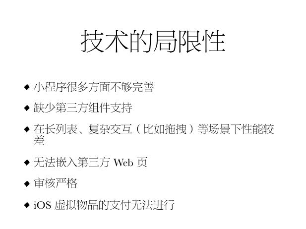 今天小程序的现状,后面会有越来越多的局限性。从技术的角度,小程序有一些是做不到的。比如多媒体、滤镜是很困难,因为它的处理能力是不如原生系统的。