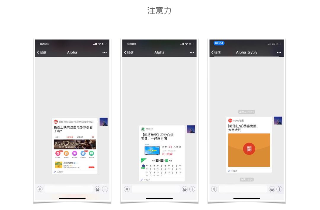 注意力,是稀缺资源。在一个上百人的大群里,各种信息往往一闪而过。怎样能够第一时间吸引到群成员的注意力?上面的例子来,很明显,第 3 个更容易吸引眼球。