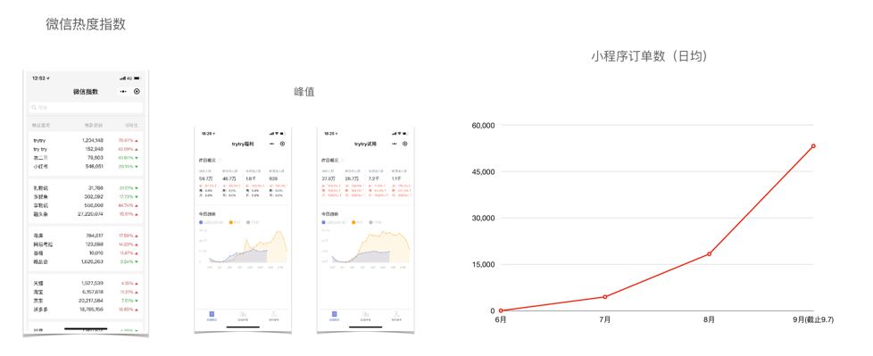 Trytry 小程序上线了一个半月,几乎零市场推广,自然增长至 450 多万用户。日活的峰值是 98 万。小程序的订单量,不到 2 个月时间,从 0 涨至日均 5 万单。